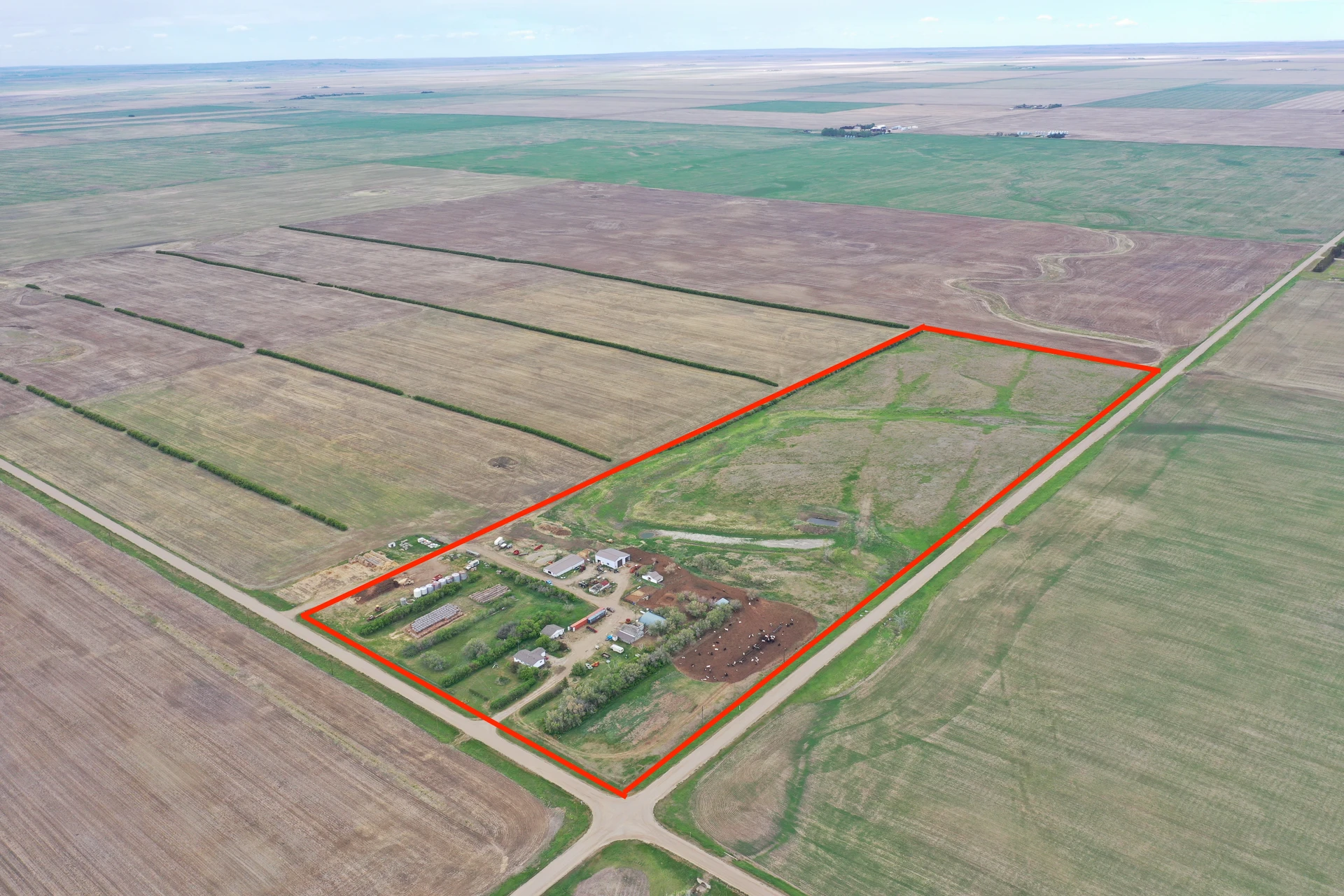 This 50-acre acreage is made up of ~10 acre yard and ~40 acres of adjacent pasture. Yard includes a house (approx 1980 build) w/ a basement, upgrades and additions. Outbuildings include a 3-car detached garage, Quonset, pole barn, calving barn, and heated shop. Heated shop is 30’ x 56’ x 19’ w/ concrete floor, mezzanine, and 16’ x 16’ overhead door, as well as a 20’ x 56’ addition on the side of the shop. Quonset is 40’ x 60’. Pole barn is 30’ x 85’. There is natural gas to the yard, which supplies the house and shop. The house water is supplied by the RM’s water line (town water). There is a well supplying water to the animals in the yard. Additionally, there is a dugout. Tankers have been removed. Hopper bins and sea cans not included, but negotiable. Property currently undergoing a subdivision from the adjacent 110 acres grain farmland. Adjacent 110 acres grain farmland (SK019397) also available for sale. Taxes, assessment, and exact acres are to be determined after subdivision